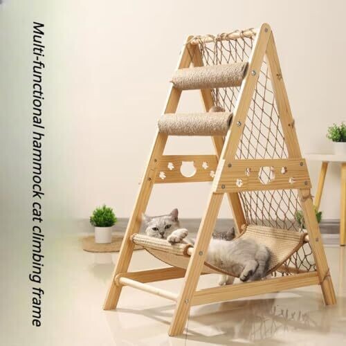 A complete all-in-one cat tower featuring a tall climbing post, sisal scratching posts, a cozy hammock, and a playful ball. Built from solid wood for safety and durability, it fits small spaces while encouraging exercise and interactive fun.