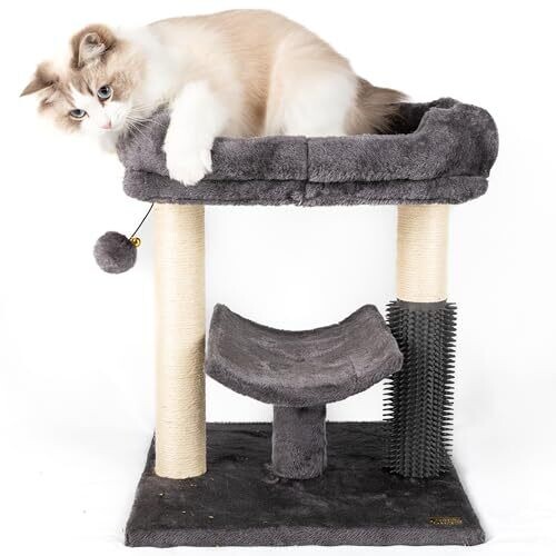 - Two vertical sisal-wrapped scratching posts to protect furniture and promote healthy clawing habits.