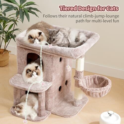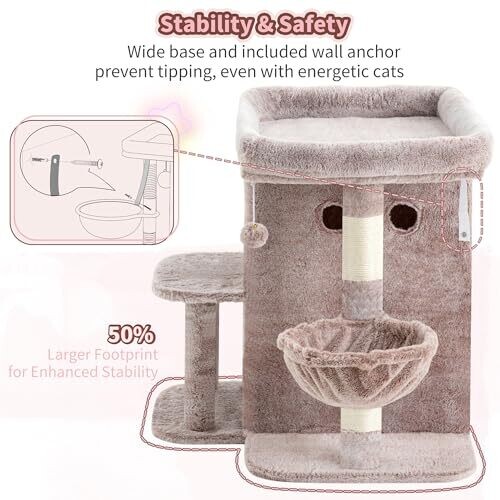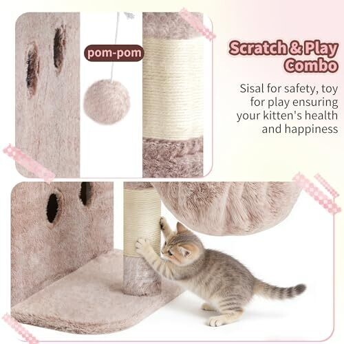 - Includes a cozy cat basket, durable sisal scratching posts, and a dangling pom-pom toy for play and enrichment.