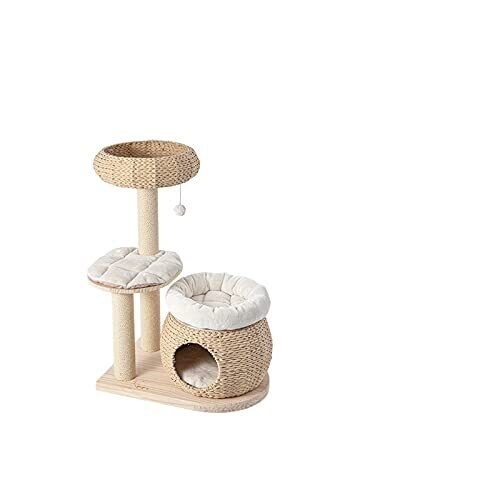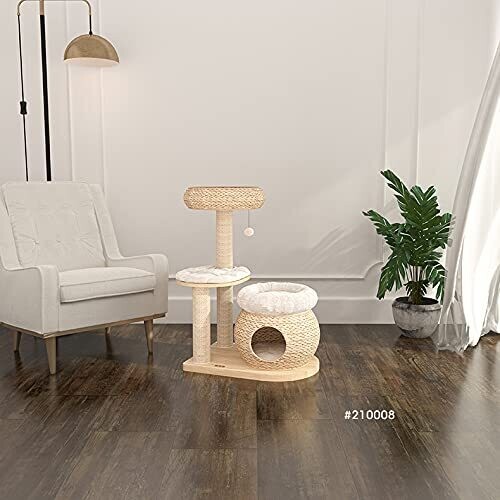 Premium bulrush cat tree featuring natural materials and modern design. Multiple levels offer climbing and lounging, with sisal scratching posts to protect furniture. Sturdy, heavy base for stability in busy homes. Space-saving tall tower; easy to assemble and durable.