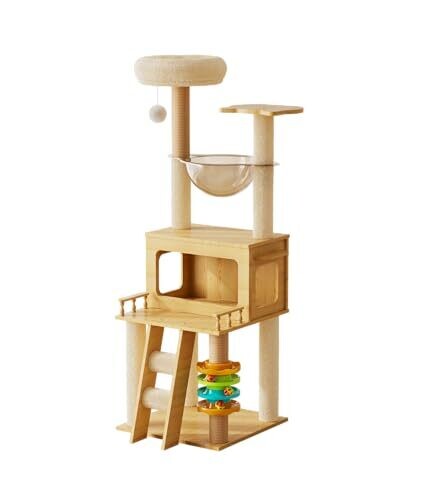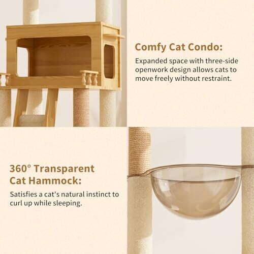 The sisal-wrapped posts provide scratching surfaces, a cozy cat condo offers a resting area, and a 360° transparent acrylic hammock adds versatile lounging options. The toy component adds ongoing enrichment for cats.
