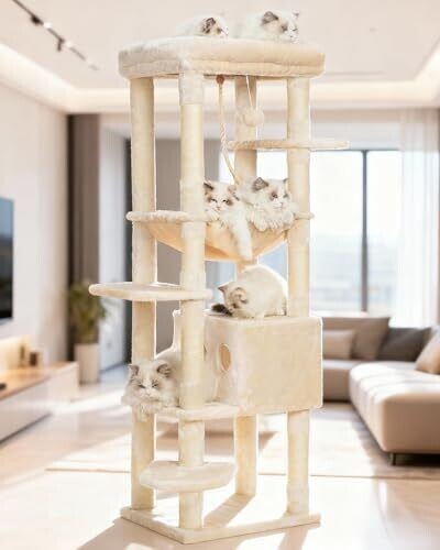 Heybly Tall Cat Tree For Large Cat 202cm Multi-Level Tower Beige HCT038M