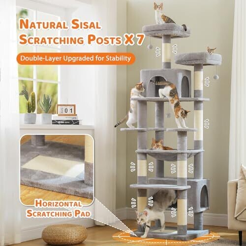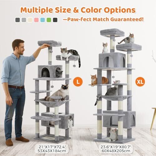 Reach new heights with a 184 cm cat tree designed for multi-cat homes. Eight levels of climbing and lounging offer space for large cats, with a wide hammock and dual condos, plus seven sisal posts to protect furniture.