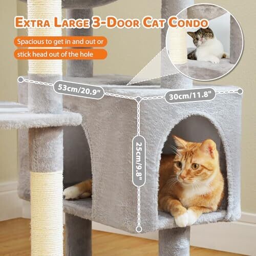 Designed for large cats with a super wide hammock and a spacious cat condo (53×30×25 cm) to accommodate multiple cats.