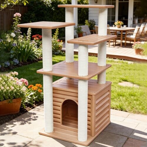 - 46” tall, weatherproof cat tree designed for both indoor and outdoor use, giving cats a complete play and rest solution
