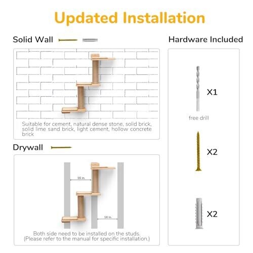 Intended for drywall installation; both sides must be mounted to studs following instructions; wider surface and covered with sisal mats on each step to reduce slipping.