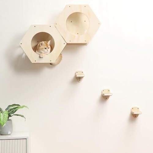 The MUSONG 3-in-1 Wall-Mounted Cat Climbing Wall is a set of 3 wall-mounted components featuring wooden supports and hemp rope steps. It is designed for indoor use and provides climbing, resting, and storage options on a vertical wall installation. The product includes pre-drilled mounting holes and installation tools for secure attachment to walls, with brackets to prevent shaking or tipping. The design aims to save floor space and accommodate multiple cats by offering individual climbing paths and resting areas.