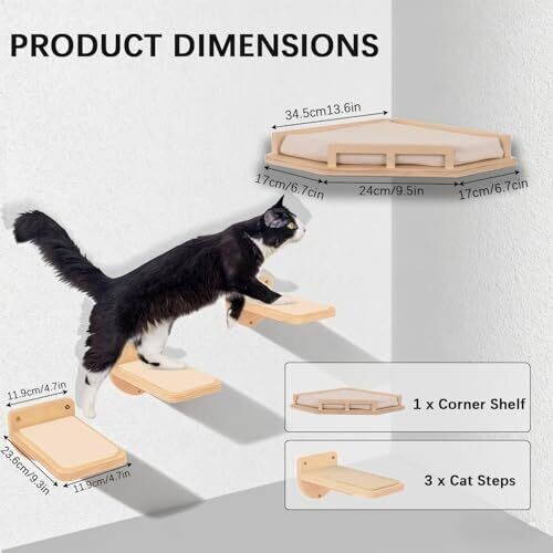 Sturdy and secure wall-mounted cat activity set designed for small and medium cats up to 15 lbs. Made from premium birch wood. Includes a detachable, machine-washable cushion for added comfort. Modern, space-saving design that fits interior decor. Pre-drilled holes and partially assembled components enable quick installation. Comes with a 6-month hassle-free warranty for daily use.