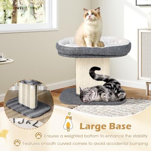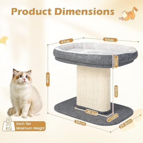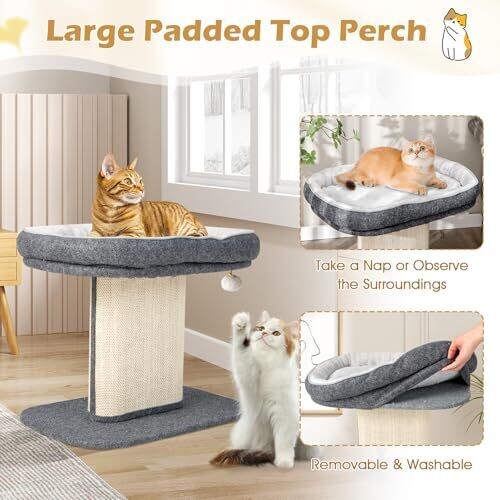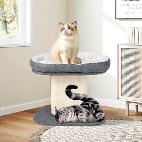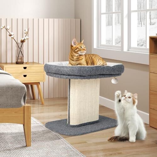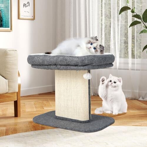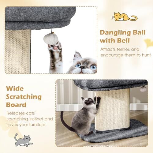 Explore a 2-tier cat climbing tree with a top perch, sisal scratching panel, jingling fur ball toy, cozy bed, and post for scratching. Modern, functional cat furniture designed for kittens and active cats in grey.