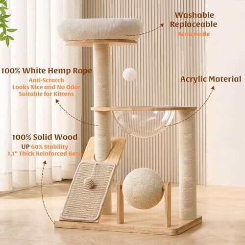 Elevate your cat's lounge with a stylish solid wood tower that combines climbing, scratching, and resting. Includes a space capsule, top perch, and removable bed for indoor comfort. Durable rubberwood with a kid-friendly finish and easy cleaning.
