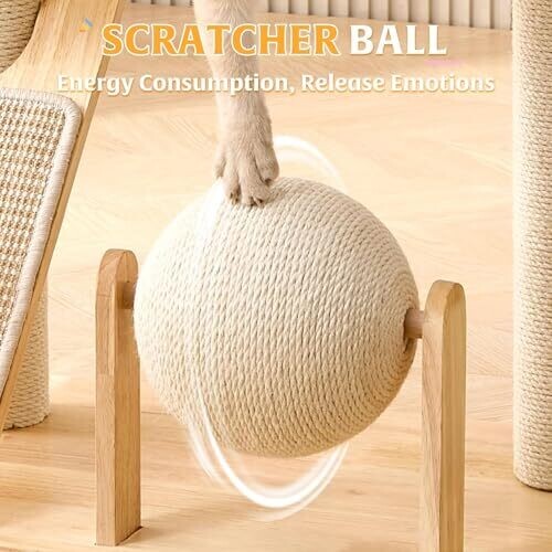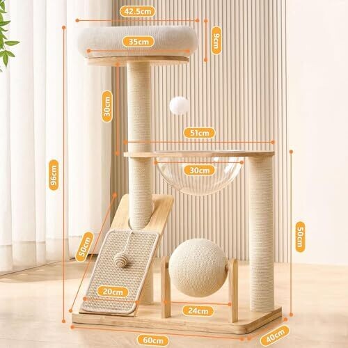 The cat tree stands 37.8 inches tall. Made from rubberwood with a water-resistant finish. Scratching posts wrapped with white sisal rope. Features a wide and sturdy base for stability. Includes a space capsule and a removable top bed for indoor cats. Comes with cat scratching balls and hanging balls for enrichment. Includes illustrated instructions and all necessary tools for easy assembly and the ability to relocate within the home.