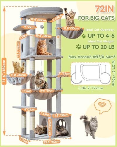 - Elevate play and relaxation with a towering 72-inch cat tree designed for indoor adventures.