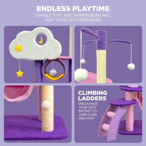 • Multi-level platforms, hanging toys and a cozy condo create a playground cats will adore.
