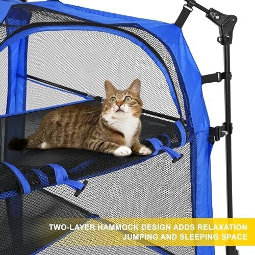 The bottom of the outdoor cat tent is made of PE material that is waterproof and moisture-proof, helping keep the cat clean while playing outside. The design is portable and easy to set up, featuring a lightweight and compact form that folds into a carry bag for travel and storage. A three-layer structure supports climbing, jumping, and exploring to satisfy a cat's natural instincts and reduce furniture scratching. The tent is suitable for outdoor and indoor use with breathable mesh and a 360-degree view, allowing pets to enjoy sun, grass, and air while staying safe. Indoors, it can accommodate kittens, isolate an injured pet, or aid in introducing a new pet, with a top cover that provides shade. The construction emphasizes stability with durable mesh, a modern head design, thicker poles, reinforced corners, fiberglass rods for each layer, four ground nails, and a 19mm iron bracket to enhance durability on patios, lawns, balconies, and similar surfaces.