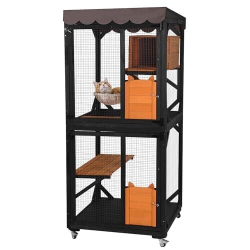 X-Zone Pet Catio On Wheels Outdoor Cat Enclosure with Bed, Scratch Post, Jumping Platforms, Waterproof Roof (Brown)