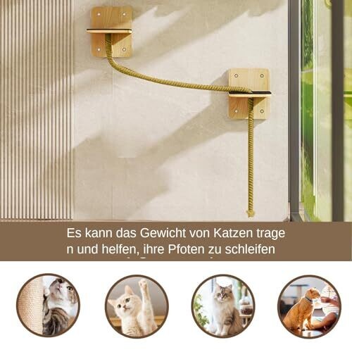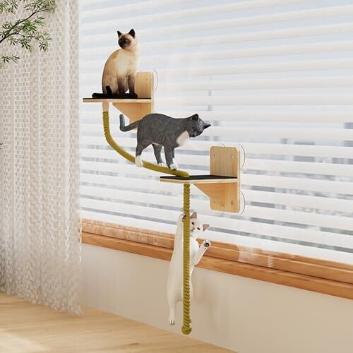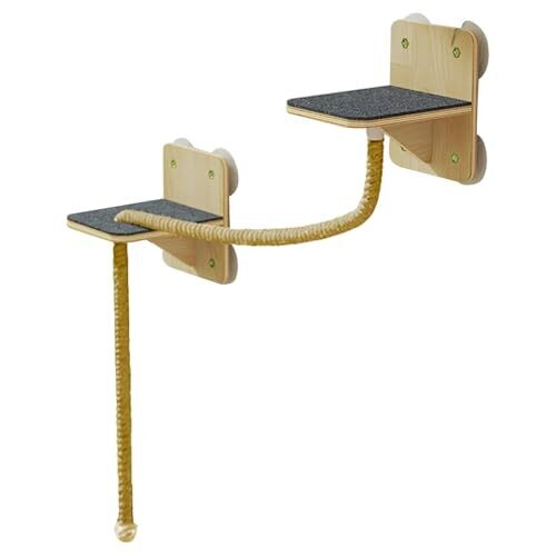 The product features a multi-stage climbing system with step platforms that flexibly conform to the wall, creating a stimulating climbing and resting environment for cats of all sizes. It uses braided ropes on a durable shelf construction to provide a secure grip during jumps and scratching, with natural materials intended for long-lasting use. A heavy-duty rope protection layer helps maintain rope quality by absorbing pressure in dense scratch areas and supports room hygiene and protection of primary structure with lasting performance. Installation is designed to be easy and tool-free, using modular expandable climbing routes with pre-installed suction cups. The design includes a sunlit window-adjacent range to mimic outdoor adventures, offering a dynamic play area and allowing cats to rest in sunlight while encouraging natural climbing behavior.