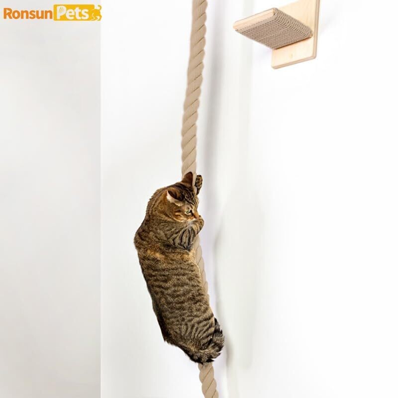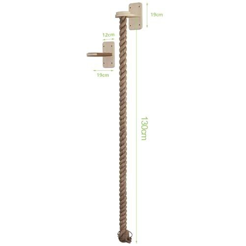 1.3 meters total wall-mounted unit with a 150 cm climbing rope and an integrated ladder. Structure includes a resting platform for lounging. Constructed from natural rustic wood components with a durable finish. Mounting onto the wall saves floor space and is intended for indoor use. Designed to promote climbing, jumping, and interactive play to support feline fitness. Suitable for cats of varying sizes; installation should follow provided mounting guidelines.