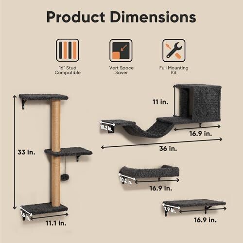 - Multi-functional design combines a cat bridge, wall bed, scratching post, and shelf in one compact system.