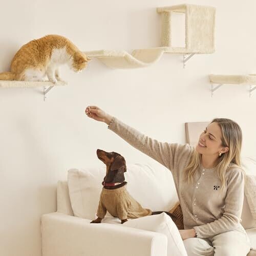 A 4-in-1 cat wall set that combines climbing, lounging, scratching, and play. Solid wood multi-layer construction with pet-friendly peach velvet for durability and minimal shedding. Easy 16-inch drywall installation with wall stud mounting for maximum stability. Includes bridge, bed, post, and shelf.